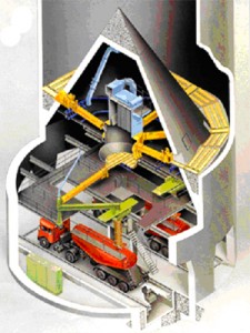 IBAU均化庫采用德國漢堡公司的連續(xù)均化技術(shù)。在外部帶一攪拌倉,庫底中心設(shè)一大圓錐,庫內(nèi)生料的重量通過該錐傳遞給庫壁,庫底環(huán)形空間被分成向中心傾斜10度的6個(gè)充氣區(qū),每區(qū)裝設(shè)3種規(guī)格的6個(gè)充氣箱。充氣卸料時(shí)生料先被送至一條徑向布置的充氣箱上,再經(jīng)過錐體下部的出料口由空氣斜槽送入庫底中央4000mm計(jì)量倉中。卸料時(shí),生料在自上而下的流動(dòng)過程中,切割水平料層而產(chǎn)生重力混合 作用,進(jìn)入攪拌倉后又連續(xù)充氣攪拌而得到進(jìn)一步均化,均化效果H可達(dá)6~8,電耗0.1~0.2Kwh/t生料。